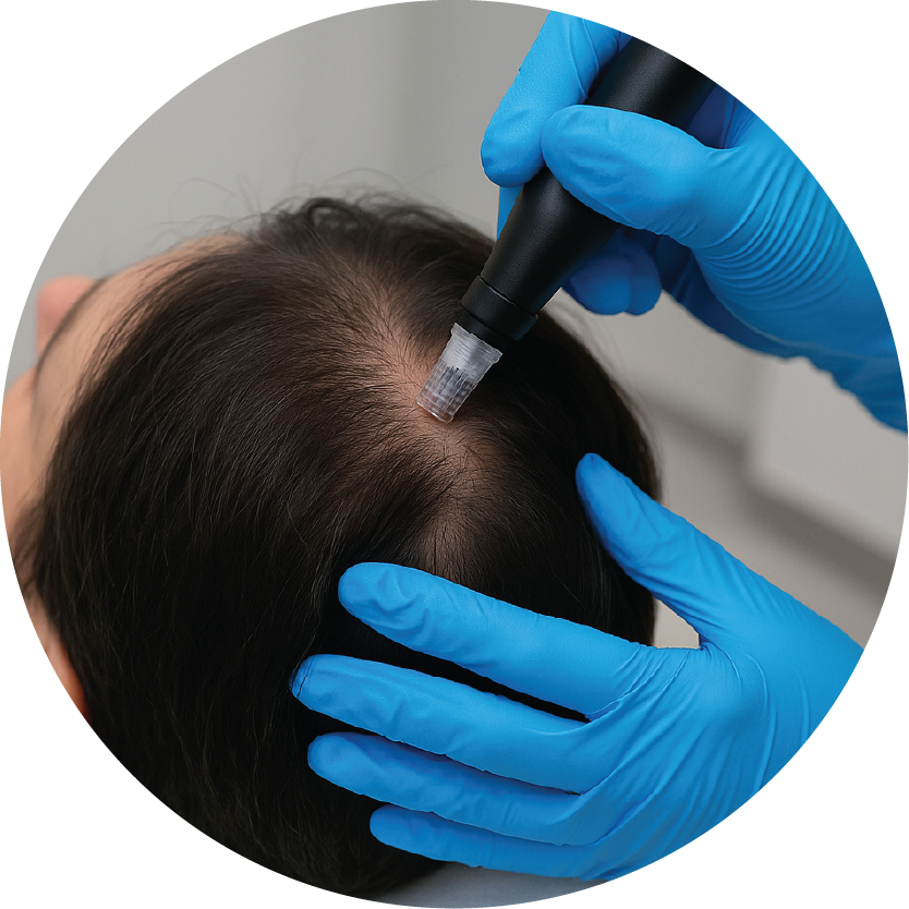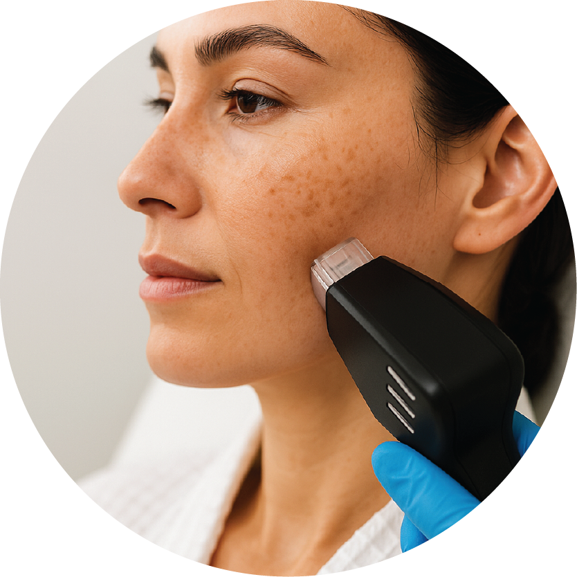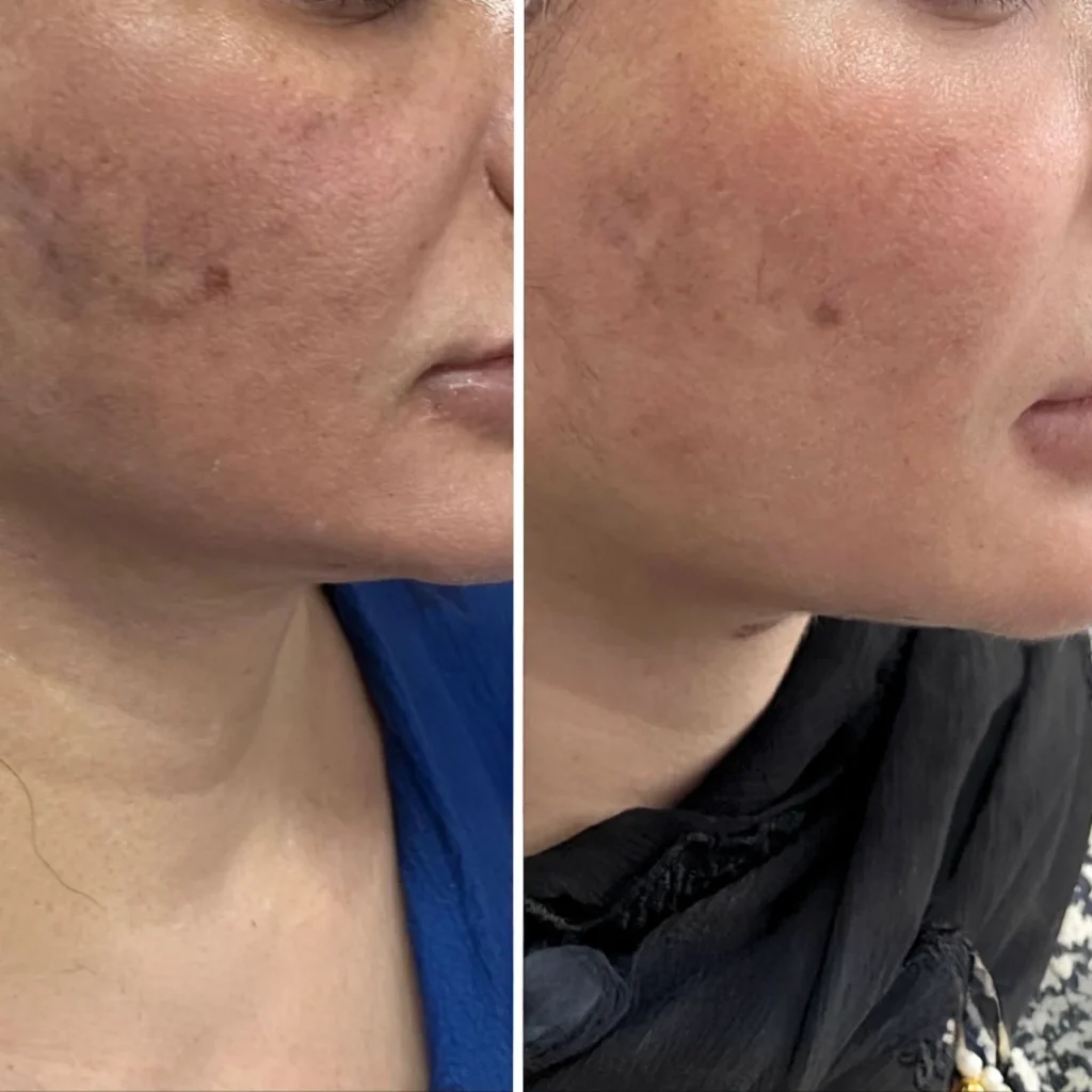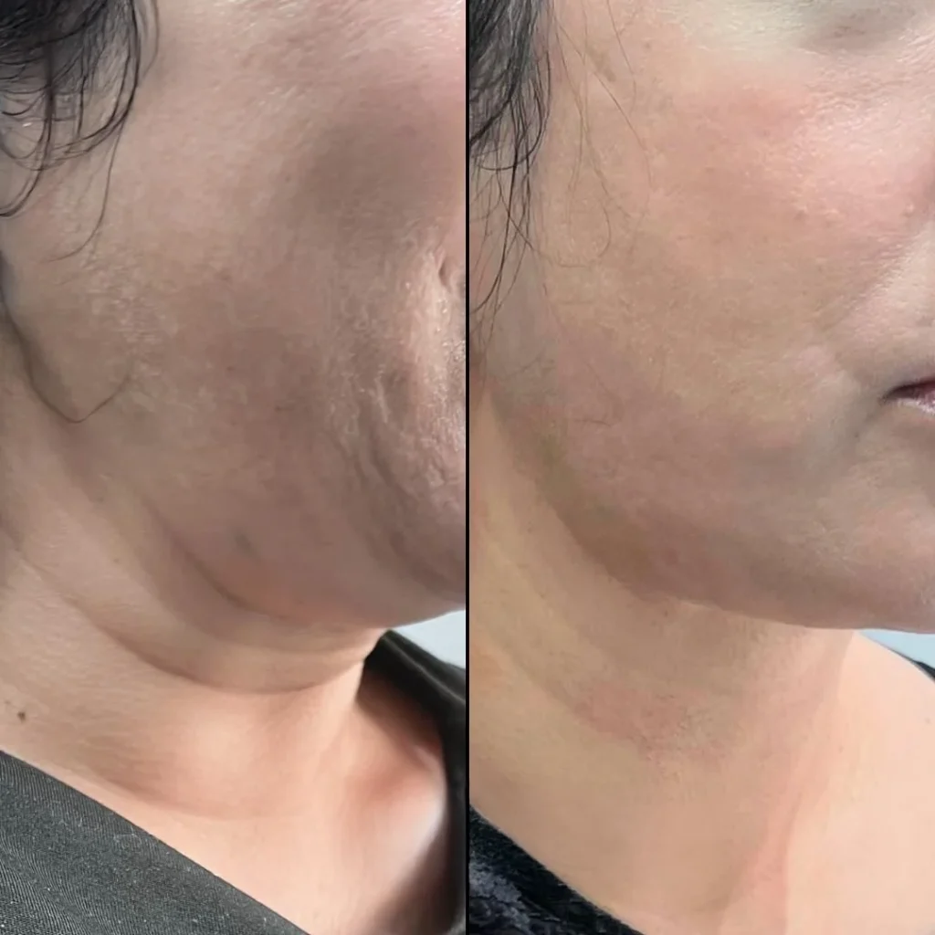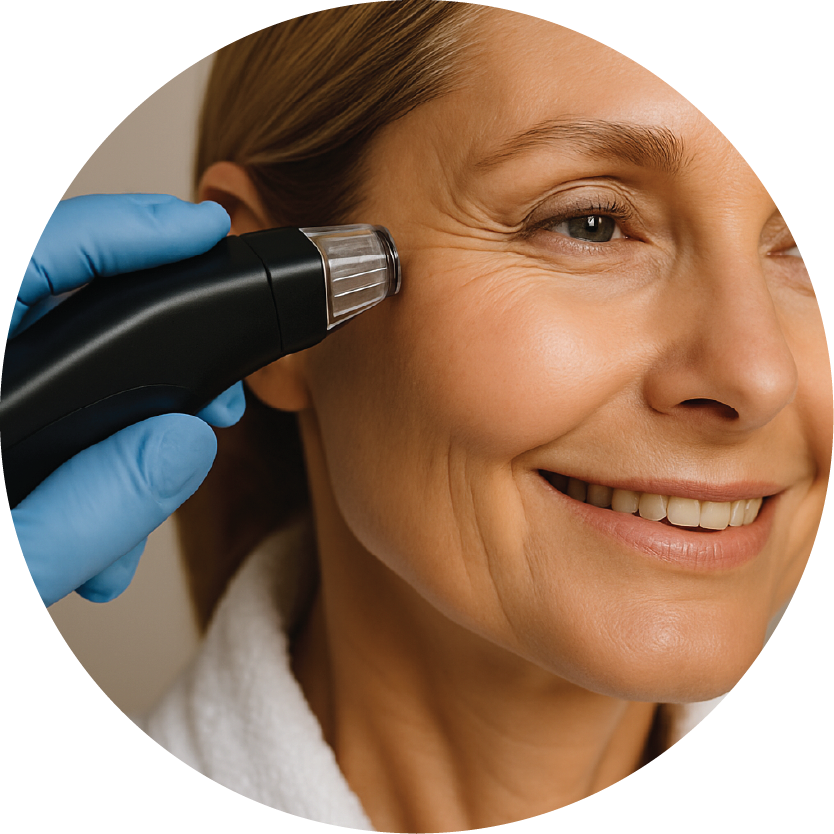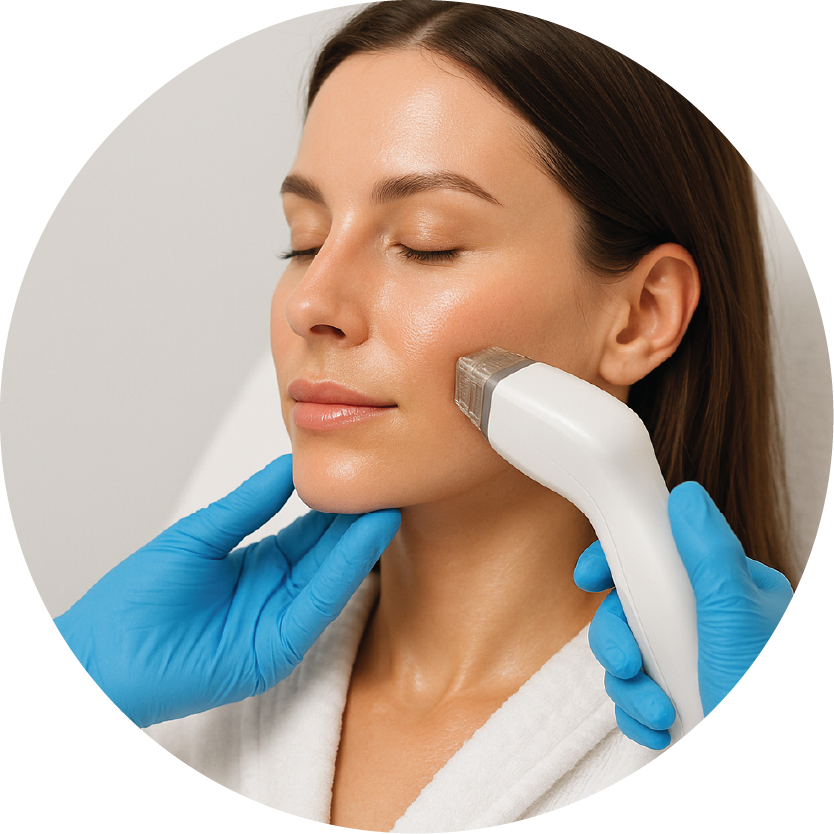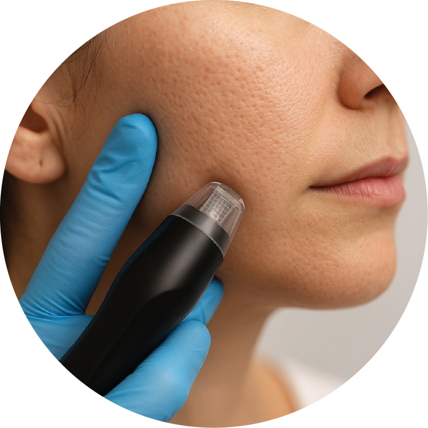 Fractional RF microneedling at customized depths; precise, overlapping passes.